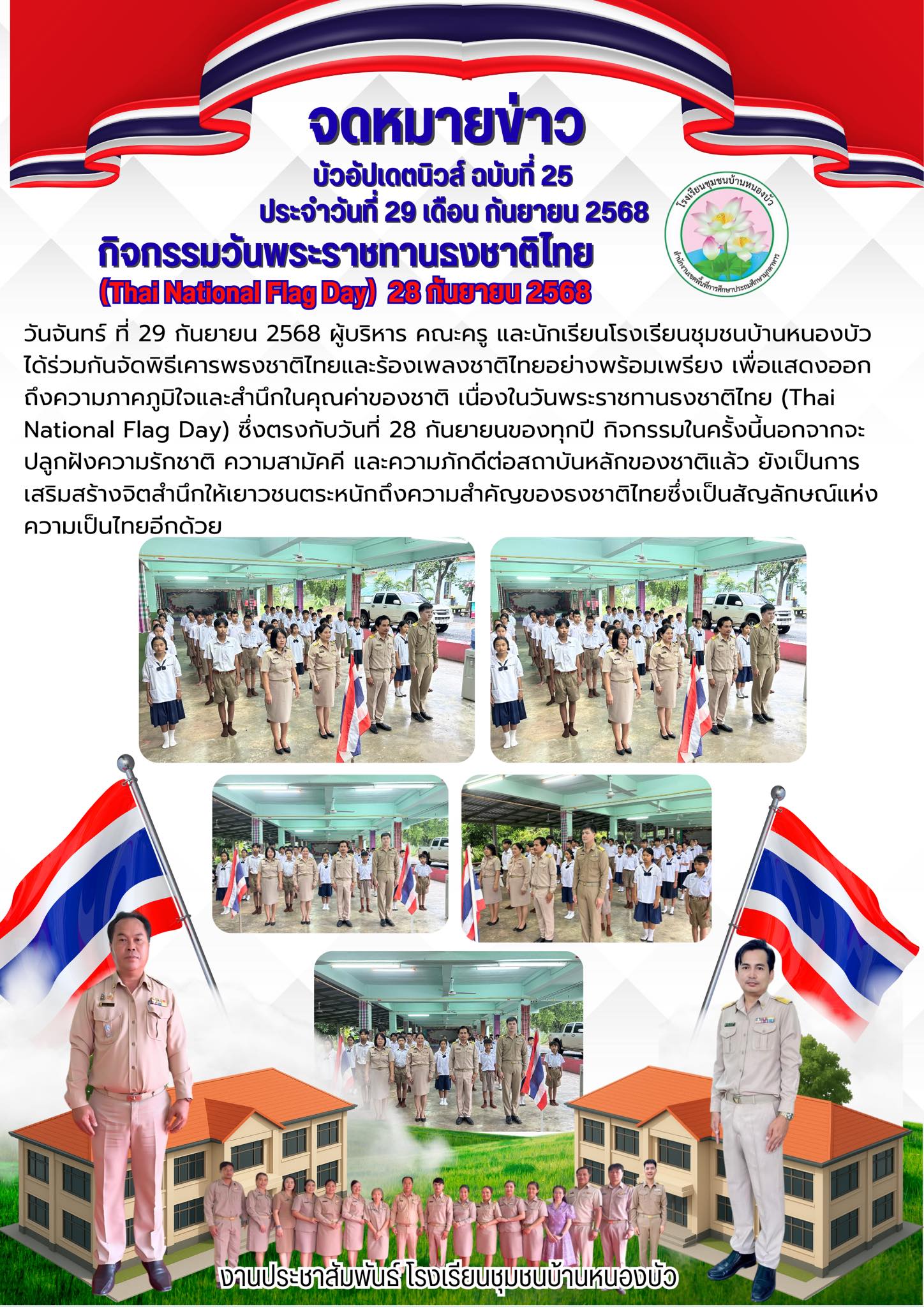 วันจันทร์ ที่ 29 กันยายน 2568 ผู้บริหาร คณะครู และนักเรียนโรงเรียนชุมชนบ้านหนองบัว ได้ร่วมกันจัดพิธีเคารพธงชาติไทยและร้องเพลงชาติไทยอย่างพร้อมเพรียง เพื่อแสดงออกถึงความภาคภูมิใจและสำนึกในคุณค่าของชาติ เนื่องในวันพระราชทานธงชาติไทย (Thai National Flag Day) ซึ่งตรงกับวันที่ 28 กันยายนของทุกปี กิจกรรมในครั้งนี้นอกจากจะปลูกฝังความรักชาติ ความสามัคคี และความภักดีต่อสถาบันหลักของชาติแล้ว ยังเป็นการเสริมสร้างจิตสำนึกให้เยาวชนตระหนักถึงความสำคัญของธงชาติไทยซึ่งเป็นสัญลักษณ์แห่งความเป็นไทยอีกด้วย