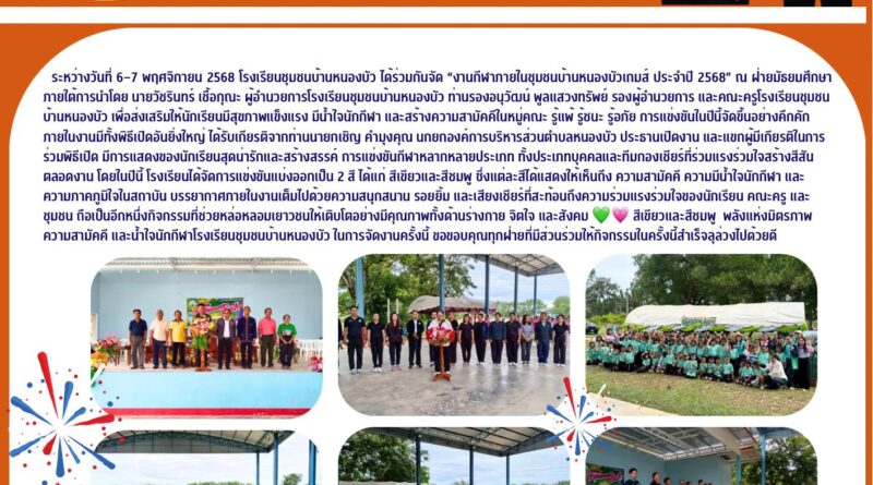 รอบรั้ว ชุมชนบ้านหนองบัว ชุมชนบ้านหนองบัวเกมส์ ปีการศึกษา 2568 admin 7 พฤศจิกายน 202517 พฤศจิกายน 2025 วันที่ 6-7 พฤศจิกายน 2568 โรงเรียนชุมชนบ้านหนองบัว จัดกิจกรรมกีฬาสี