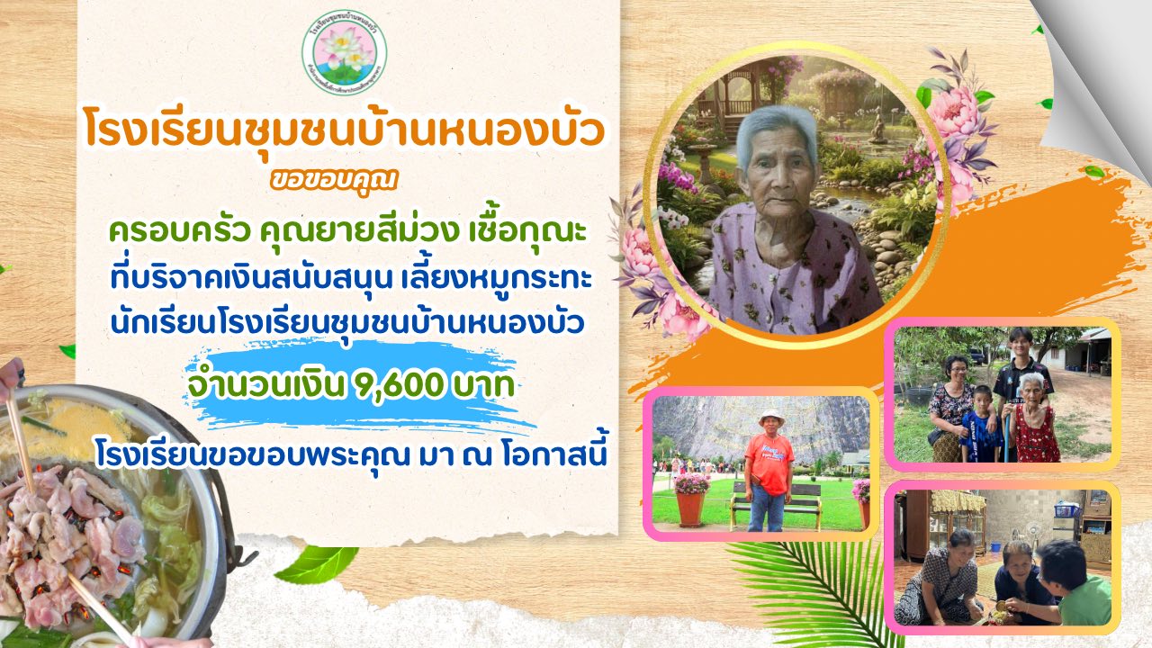 โรงเรียนชุมชนบ้านหนองบัว ขอขอบคุณครอบครัว คุณยายสีม่วง เชื้อกุณะ ที่บริจาคเงินจำนวนเงิน 9,600 บาท เลี้ยงหมูกระทะ ลูกนักเรียน เงินบริจาคครั้งนี้ไม่ได้เป็นเพียงแค่มื้ออาหารที่แสนพิเศษ แต่ยังเป็น กำลังใจ และ ความรัก ที่ท่านได้มอบให้นักเรียนของเรา โรงเรียนชุมชนบ้านหนองบัว ขออำนาจคุณพระศรีรัตนตรัยและสิ่งศักดิ์สิทธิ์ทั้งหลาย จงดลบันดาลให้ครอบครัวคุณยายสีม่วง เชื้อกุณะ จงมีแต่ความสุข ความเจริญ สุขภาพแข็งแรง คิดหวังสิ่งใดขอให้สมความปรารถนาทุกประการเทอญ