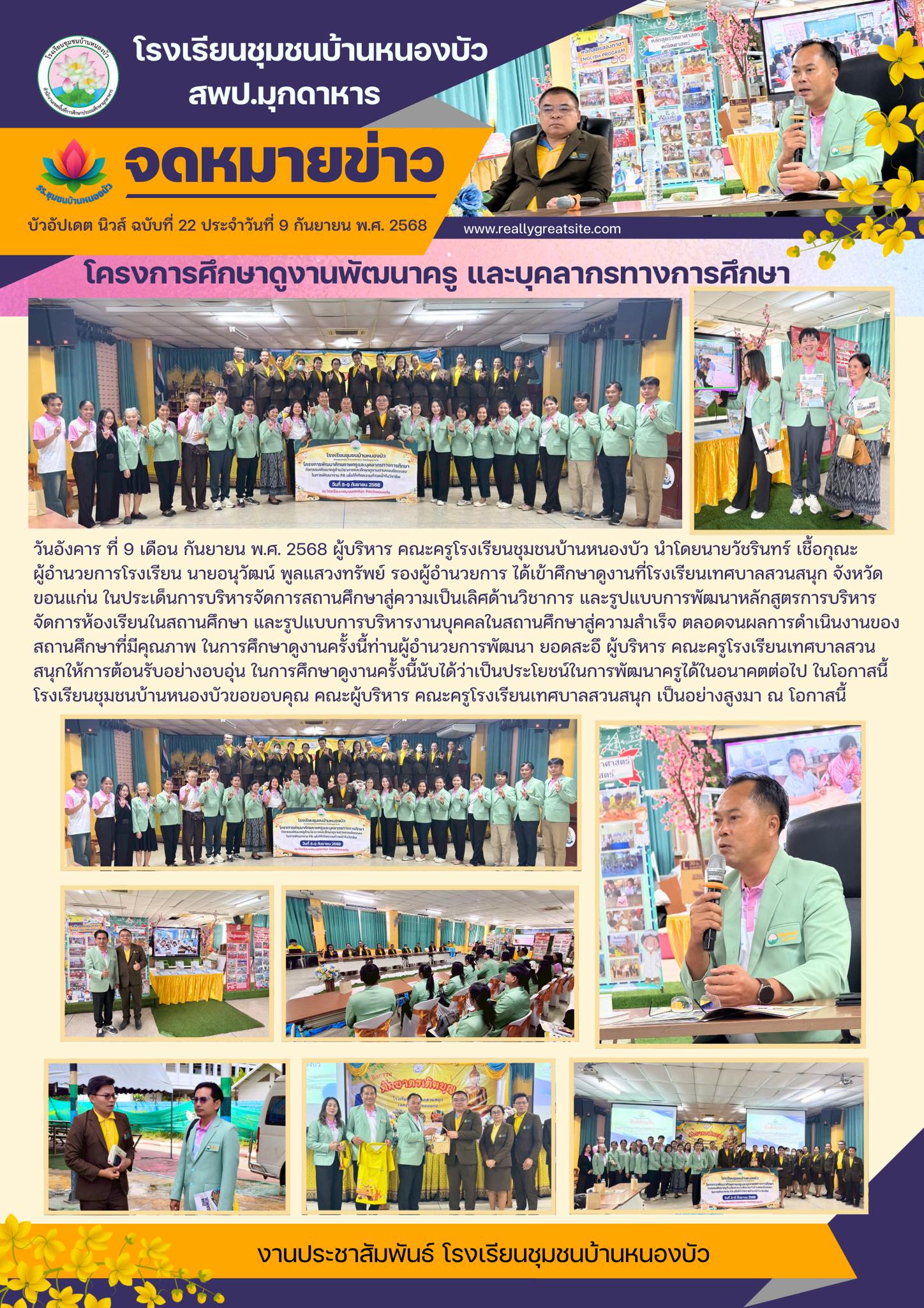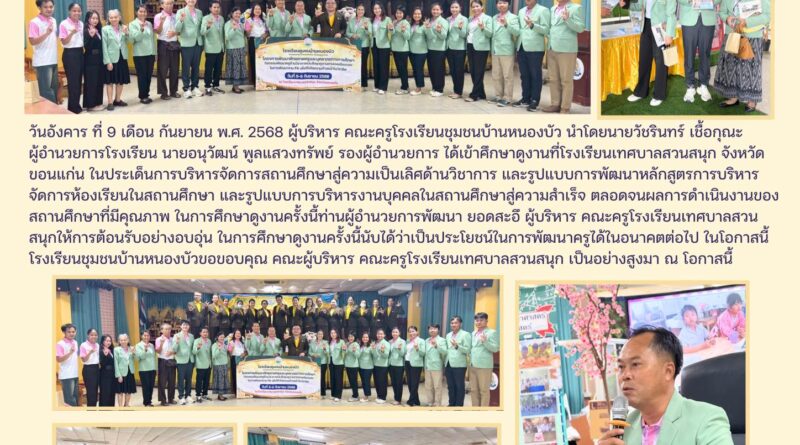 วันอังคาร ที่ 9 เดือน กันยายน พ.ศ. 2568 ผู้บริหาร นำโดยนายวัชรินทร์ เชื้อกุณะ ผู้อำนวยการโรงเรียนชุมชนบ้านหนองบัว นายอนุวัฒน์ พูลแสวงทรัพย์ รองผู้อำนวยการ ได้นำคณะครูได้เข้าศึกษาดูงานที่โรงเรียนเทศบาลสวนสนุก จังหวัดขอนแก่น ในประเด็นการบริหารจัดการสถานศึกษาสู่ความเป็นเลิศด้านวิชาการ และรูปแบบการพัฒนาหลักสูตรการบริหารจัดการห้องเรียนในสถานศึกษา และรูปแบบการบริหารงานบุคคลในสถานศึกษาสู่ความสำเร็จ ตลอดจนผลการดำเนินงานของสถานศึกษาที่มีคุณภาพ ในการศึกษาดูงานครั้งนี้ท่านผู้อำนวยการพัฒนา ยอดสะอึ ผู้บริหาร คณะครูโรงเรียนเทศบาลสวนสนุกให้การต้อนรับอย่างอบอุ่น เกิดการแลกเปลี่ยนเรียนรู้ ในการศึกษาดูงานครั้งนี้นับได้ว่าเป็นประโยชน์ในการพัฒนาครูได้ในอนาคตต่อไป ในโอกาสนี้โรงเรียนชุมชนบ้านหนองบัวขอขอบคุณ คณะผู้บริหาร คณะครูโรงเรียนเทศบาลสวนสนุก เป็นอย่างสูงมา ณ โอกาสนี้