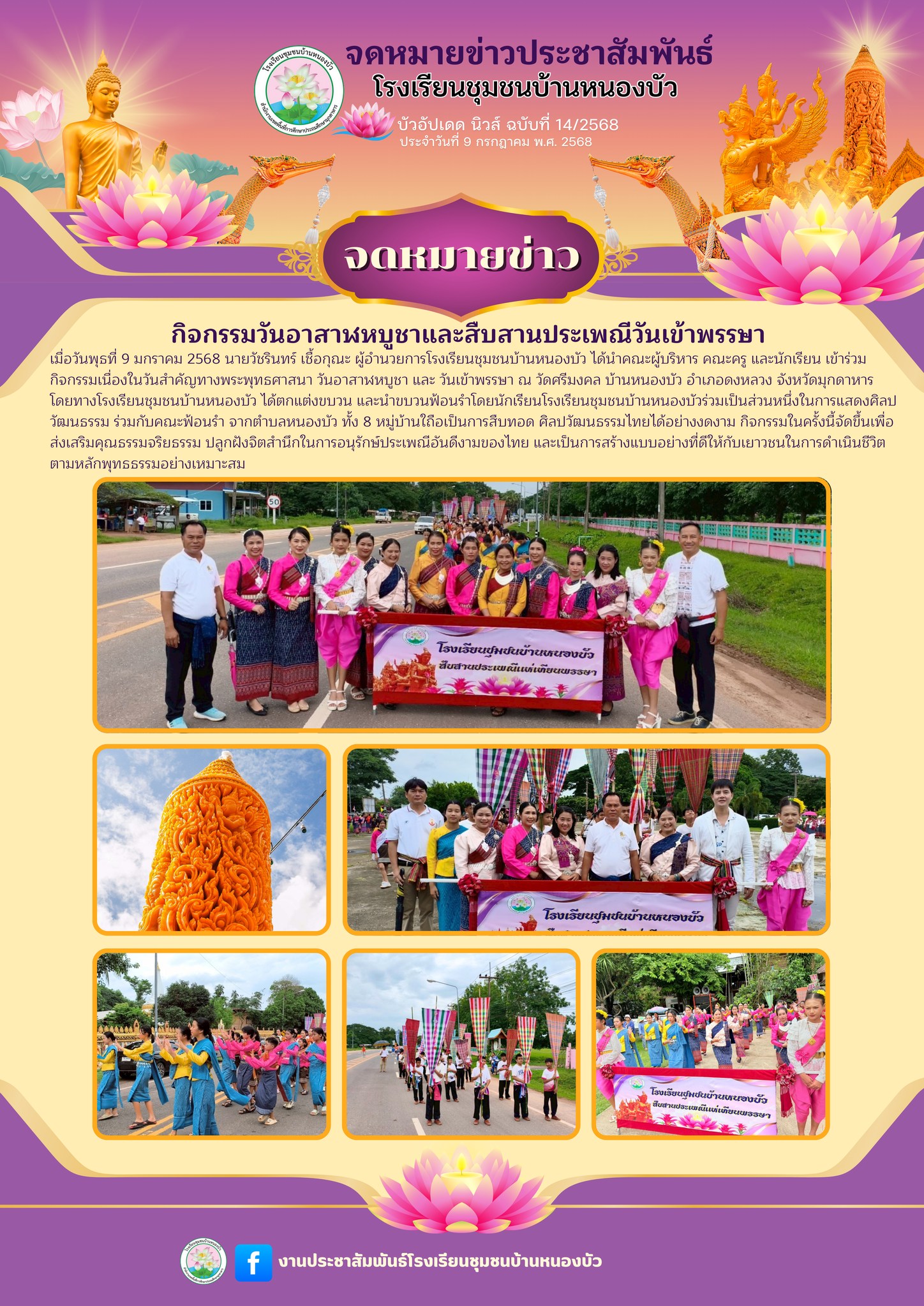วันที่ 9 กรกฎาคม 2568 โรงเรียนชุมชนบ้านหนองบัว ร่วมกิจกรรมวันอาสาฬหบูชาและสืบสานประเพณีวันเข้าพรรษา ประจำปี 2568