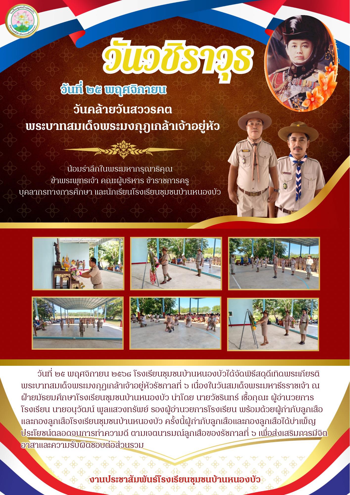 วันที่ ๒๕ พฤศจิกายน ๒๕๖๘ โรงเรียนชุมชนบ้านหนองบัวได้จัดพิธีสดุดีเทิดพระเกียรติพระบาทสมเด็จพระมงกุฏเกล้าเจ้าอยู่หัวรัชกาลที่ ๖ เนื่องในวันสมเด็จพระมหาธีรราชเจ้า ณ ฝ่ายมัธยมศึกษาโรงเรียนชุมชนบ้านหนองบัว นำโดย นายวัชรินทร์ เชื้อกุณะ ผู้อำนวยการโรงเรียน นายอนุวัฒน์ พูลแสวงทรัพย์ รองผู้อำนวยการโรงเรียน พร้อมด้วยผู้กำกับลูกเสือและกองลูกเสือโรงเรียนชุมชนบ้านหนองบัว ครั้งนี้ผู้กำกับลูกเสือและกองลูกเสือได้บำเพ็ญประโยชน์ตลอดจนการทำความดี ตามเจตนารมณ์ลูกเสือของรัชกาลที่ ๖ เพื่อส่งเสริมการมีจิตอาสาและความรับผิดชอบต่อส่วนรวม