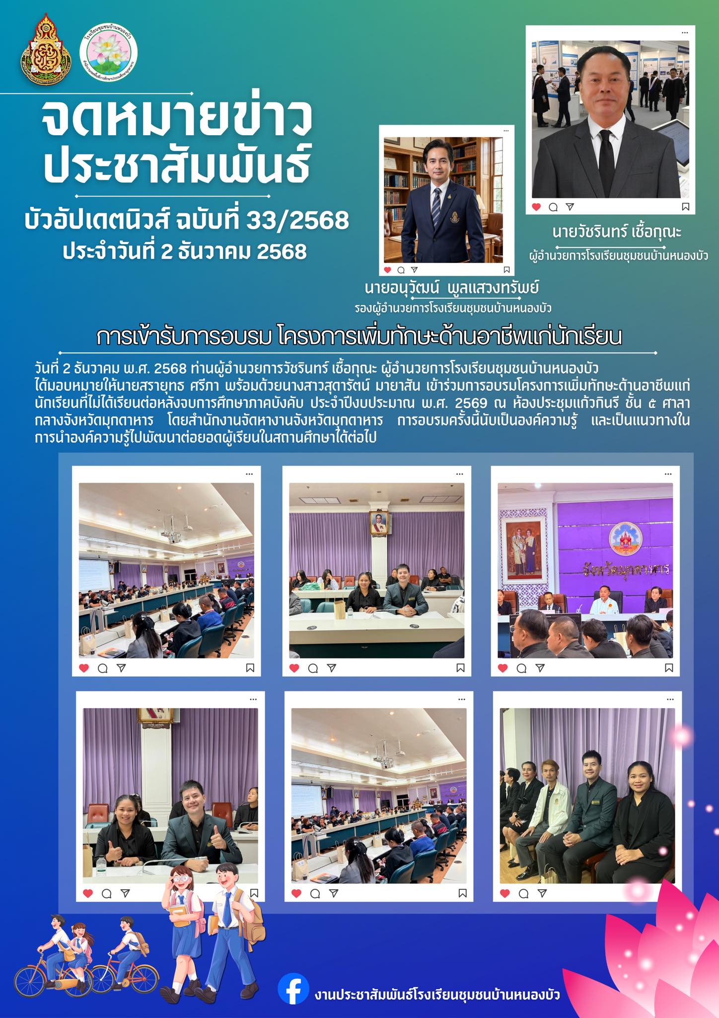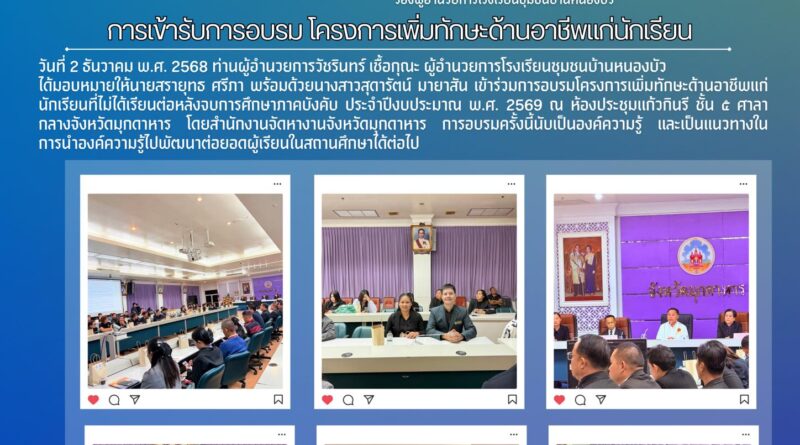วันที่ 2 ธันวาคม พ.ศ. 2568 ท่านผู้อำนวยการวัชรินทร์ เชื้อกุณะ ผู้อำนวยการโรงเรียนชุมชนบ้านหนองบัว ได้มอบหมายให้นายสรายุทธ ศรีภา พร้อมด้วยนางสาวสุดารัตน์ มายาสัน เข้าร่วมการอบรมโครงการเพิ่มทักษะด้านอาชีพแก่นักเรียนที่ไม่ได้เรียนต่อหลังจบการศึกษาภาคบังคับ ประจำปีงบประมาณ พ.ศ. 2569 ณ ห้องประชุมแก้วกินรี ชั้น ๕ ศาลากลางจังหวัดมุกดาหาร โดยสำนักงานจัดหางานจังหวัดมุกดาหาร การอบรมครั้งนี้นับเป็นองค์ความรู้ และเป็นแนวทางในการนำองค์ความรู้ไปพัฒนาต่อยอดอาชีพให้ผู้เรียนได้เมื่อสำเร็จการศึกษาภาคบังคับ
