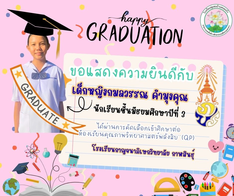 โรงเรียนชุมชนบ้านหนองบัว ขอแสดงความยินดีกับนักเรียน เด็กหญิงกมลวรรณ คำมุงคุณ นักเรียนชั้นมัธยมศึกษาปีที่ 3 ที่ผ่านการคัดเลือกเข้าศึกษาต่อ #ห้องเรียนคุณภาพวิทยาศาสตร์พลังสิบ (QP) โรงเรียนกาญจนาภิเษกวิทยาลัย กาฬสินธุ์