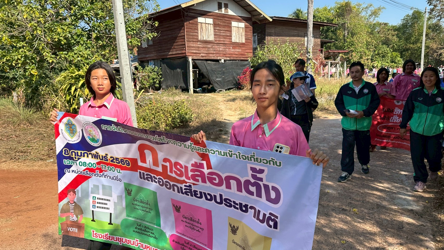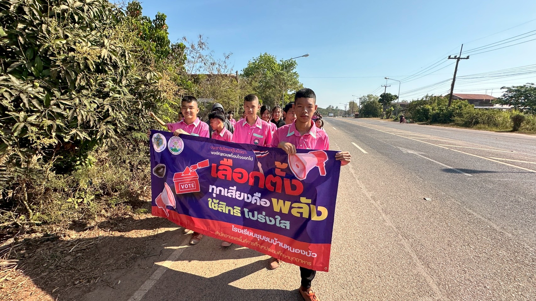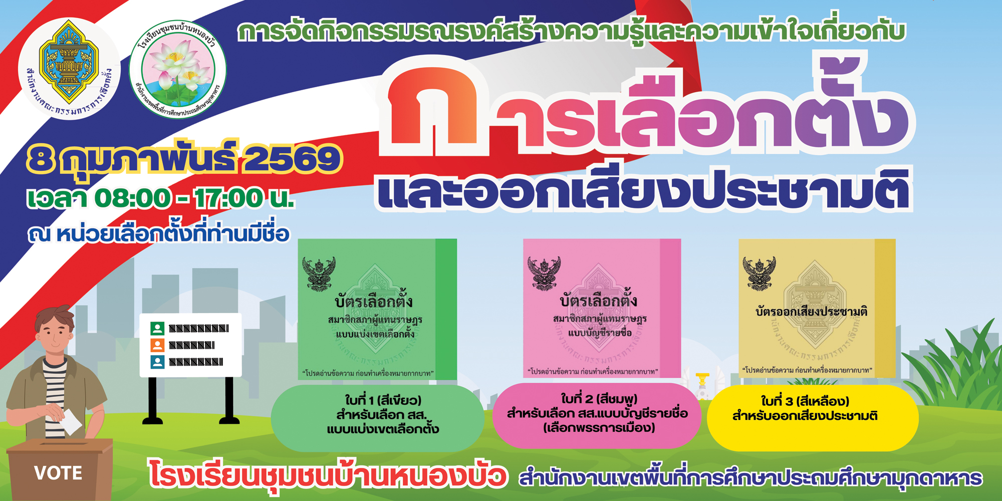 วันที่ 6 กุมภาพันธ์ 2569 โรงเรียนชุมชนบ้านหนองบัว นำโดย นายวัชรินทร์ เชื้อกุณะ ผู้อำนวยการโรงเรียน นายอนุวัฒน์ พูลแสวงทรัพย์ รองผู้อำนวยการโรงเรียน คณะครูและนักเรียน จัดกิจกรรมรณรงค์และประชาสัมพันธ์การเลือกตั้งสมาชิกสภาผู้แทนราษฎรและการออกเสียงประชามติ โดยมีกิจกรรมให้ความรู้หน้าเสาธง ประชาสัมพันธ์เสียงตามสายและเดินรงค์รอบหมู่บ้านในเขตพื้นที่หน่วยเลือกตั้ง ตำบลหนองบัว อำเภอดงหลวง จังหวัดมุกดาหาร